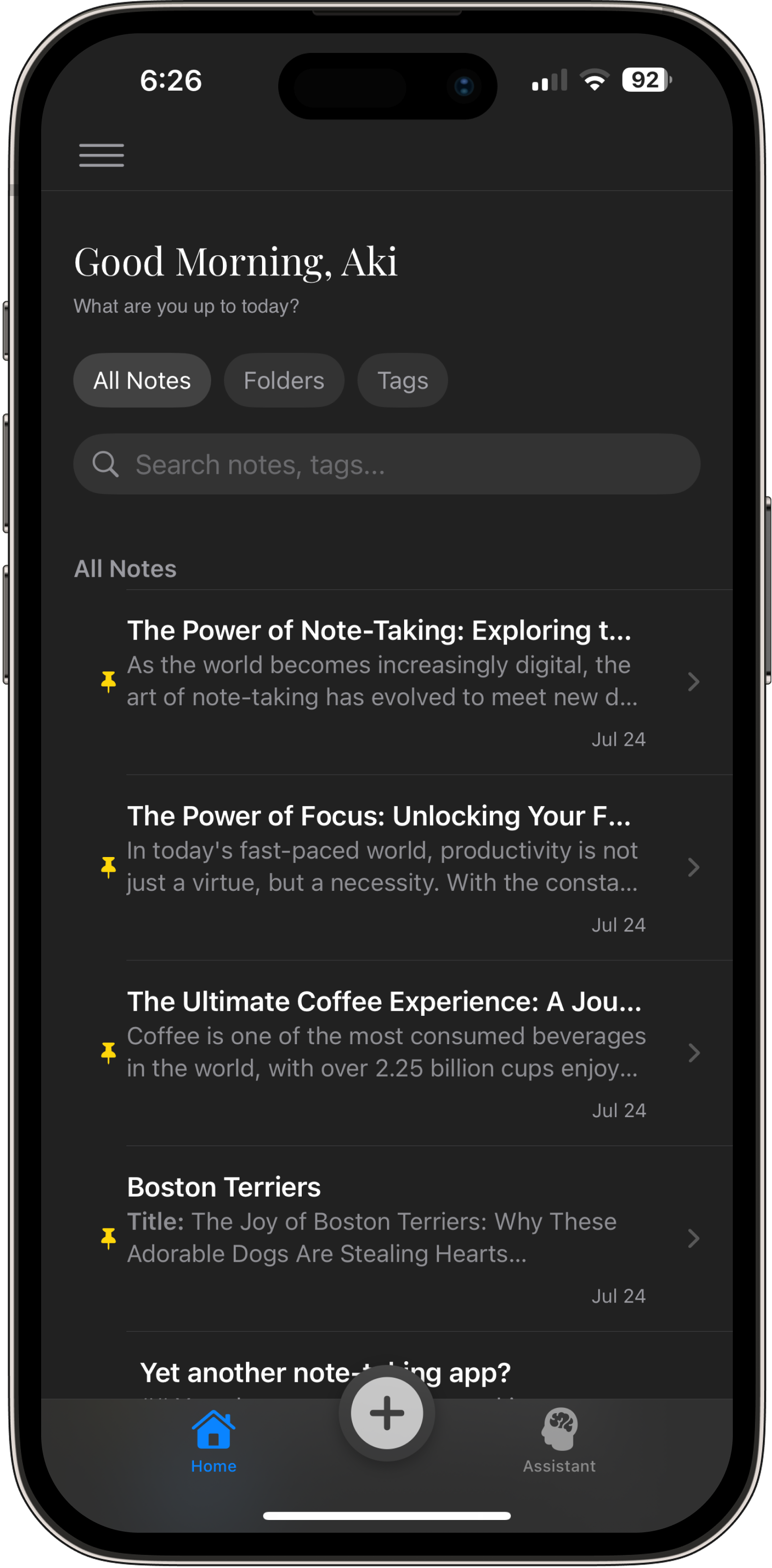 Speakeasy Notes is the revolutionary iOS note-taking app that transforms your voice into organized, intelligent notes. It's a local-only app with powerful local on-device AI capabilities, ensuring your data stays private and secure, even offline.